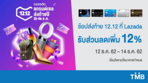 บัตรเครดิต TMB ร่วมกับ Lazada ชวนช้อปออนไลน์สุดคุ้ม 12.12 มอบส่วนลดเพิ่ม 12% เมื่อช้อปครบ 1,200 บาทขึ้นไป ที่ www.lazada.co.th หรือ LAZ APP สูงสุด 250 บาท เพียงใส่โค้ด TMBGYS12 โดยคำนวณจากยอดใช้จ่ายจริงหลังจากหักส่วนลดต่างๆ แล้ว ระหว่างวันที่ 12-14 ธันวาคม 2562 เท่านั้น สงวนสิทธิ์การใช้โค้ด 1 ครั้ง / ผู้ใช้ และโค้ดมีจำนวนจำกัด สอบถามละเอียดเพิ่มเติมได้ที่ TMB Contact Center โทร. 1558 และ www.tmbbank.com