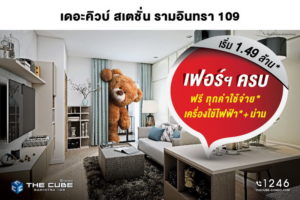 เดอะคิวบ์ สเตชั่น รามอินทรา 109 (The Cube Station Ramintra 109) คอนโดมิเนียมสไตล์โมเดิร์นใหม่ (Low Rise) 8 ชั้น พร้อมโอนกรรมสิทธิ์และเข้าพักอาศัย เพียง 250 เมตร ถึงรถไฟฟ้าสายสีชมพู สถานีบางชัน (เปิดบริการปี 2564) พัฒนาและบริหารงานโดยบริษัท คิวบ์ เรียล พร็อพเพอร์ตี้ จำกัด จัดโปรโมชั่นส่งท้ายปีเก่าต้อนรับปีใหม่ 2563 พร้อมร่วมแคมเปญพิเศษ ‘บ้านในฝัน รับปีใหม่’ ในราคาคอนโดมิเนียมไม่เกิน 3 ล้านบาท ซื้อปุ๊บ โอนปั๊บ รับทันที 3 สิทธิพิเศษ (ภายใน 31 ธ.ค.62) คือ กู้ ธอส.ดอกเบี้ย 2.50% คงที่ 3 ปี ฟรีค่าใช้จ่ายการโอนกรรมสิทธิ์และจดจำนอง และรับส่วนลดของแถมอลังการจากโครงการ โดยราคาเริ่มต้นเพียง 1.49 ล้านบาท* พร้อมเฟอร์นิเจอร์ครบทุกฟังก์ชั่น (Fully Furnished) จาก Modernform มีขนาดตั้งแต่ 24 – 34 ตารางเมตร รับฟรี เครื่องใช้ไฟฟ้าหลายรายการ* และผ้าม่านสวย ๆ พร้อมสิ่งอำนวยความสะดวกและพื้นที่ใช้สอยส่วนกลางมากมาย อาทิ สระว่ายน้ำระบบเกลือ ห้องฟิตเนส ห้องซาวน่า (แยกชาย/หญิง) ห้องสมุด สวนหย่อม คีย์การ์ดเข้าอาคารและลิฟท์แบบล็อคชั้น กล้องวงจรปิด CCTV รอบโครงการ ระบบรักษาความปลอดภัยตลอด 24 ชั่วโมง Wi-Fi อินเตอร์เน็ตที่ล็อบบี้ส่วนกลาง ชุมชนใกล้เคียงมีความปลอดภัยน่าอยู่ ติดถนนพระยาสุเรนทร์ และถนนรามอินทราซอย 109 สะดวกทุกการเดินทาง ใกล้สถาบันการศึกษา แหล่งธุรกิจ โรงพยาบาล ศูนย์การค้า ร้านอาหาร คอมมูนิตี้มอลล์ ร้านสะดวกซื้อ ตลาดสด ฯลฯ (* เงื่อนไขเป็นไปตามที่บริษัทกำหนดหรือจนกว่าของแถมจะหมด) สอบถามเพิ่มเติมโทร. 1246 (กดเลือก The Cube Station Ramintra 109) ชมโครงการจริงวิวจริงได้ทุกวันไม่เว้นวันหยุด ติดตามความเคลื่อนไหวทางเฟซบุ๊ค : www.facebook.com/TheCubeCondominium ไลน์บริษัท : @TheCubeCondo เว็บไซต์ www.thecube-condo.com