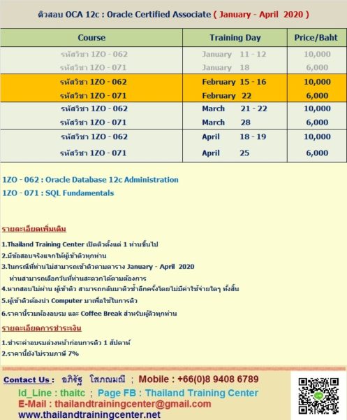 โดยผู้เข้าอบรมจะได้รับการแนะนำเทคนิคเพื่อการสอบ OCA : Oracle Certified Associate และจะมีการทดลองสอบจากระบบกับคอมพิวเตอร์ ( Online Test ) จะมีข้อสอบให้ซึ่งเป็นข้อสอบจริงที่ใช้ในการสอบ เพื่อให้ผู้เข้าอบรมคุ้นเคยกับแนวข้อสอบ และได้ทดลองสอบในสภาพแวดล้อมที่ใกล้เคียงกับการสอบจริง เพื่อให้ผู้อบรมเกิดความมั่นใจ และเพิ่มโอกาสในการสอบผ่าน OCA ให้มากขึ้น ( ค่าสอบ OCA : 150 USD/วิชา )