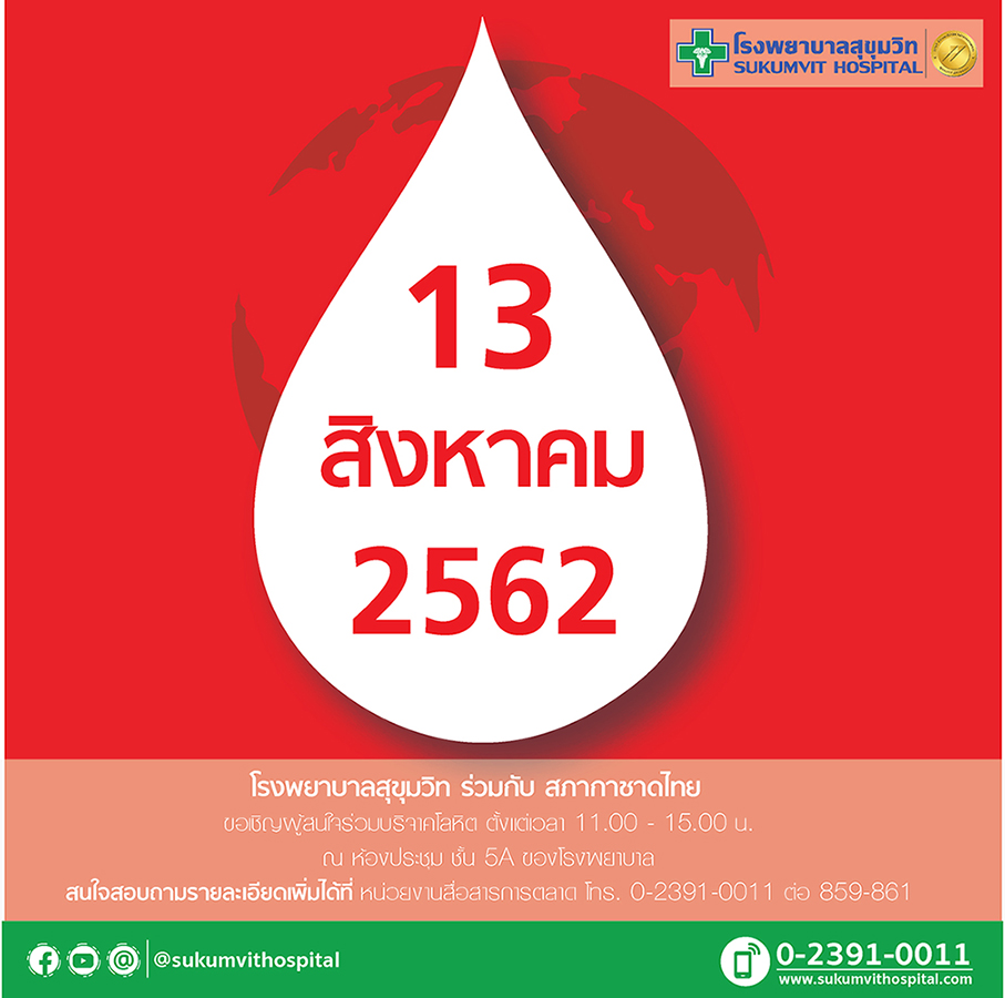 โรงพยาบาลสุขุมวิท ร่วมกับ สภากาชาดไทย ขอเรียนเชิญผู้สนใจ บริจาคโลหิต เพื่อจัดหาโลหิตให้กับผู้ป่วยทั่วประเทศ ตามโรงพยาบาลต่างๆ โดยไม่หวังสิ่งตอบแทน ในวันอังคารที่ 13 สิงหาคม 2562 ตั้งแต่เวลา 11.00 – 15.00 น. ณ ห้องประชุม ชั้น 5A ของโรงพยาบาลฯ สนใจสอบถามรายละเอียดเพิ่มเติมได้ที่ หน่วยงานสื่อสารการตลาด โทร. 02-391-0011 ต่อ 859-861