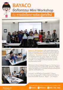 ซึ่งกิจกรรมการเรียนการสอนของ Bayaco Co -Working Space เรามุ่งเน้นการพัฒนาความรู้ พัฒนาฝีมือ ฝึกฝนทักษะ ให้ผู้เรียนพร้อมก้าวเข้าสู่สังคมแห่งการเรียนรู้อย่างเต็มรูปแบบ เรียนรู้ ลงมือปฏิบัติจริง สอนโดยผู้เชี่ยวชาญ