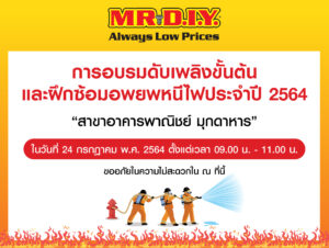 กรุงเทพฯ, 23 กรกฎาคม 2564 – บริษัท มิสเตอร์. ดี.ไอ.วาย. (กรุงเทพ) จำกัด จะมีการฝึกซ้อมแผนดับเพลิง และอพยบหนีไฟ ประจำปี 2564 ที่ร้านมิสเตอร์. ดี.ไอ.วาย. (MR.DIY) สาขา อาคารพาณิชย์ จังหวัดมุกดาหาร ในวันเสาร์ที่ 24 กรกฎาคม 2564 ตั้งแต่เวลา 09.00 น. – 11.00 น. ทั้งนี้ ทางบริษัทฯ ได้จัดการซ้อมอพยบหนีไฟ ให้กับทีมงานประจำสาขา เพื่อสร้างความตระหนักถึงความปลอดภัยระหว่างปฏิบัติงาน ควบคู่ไปกับการปฐมพยาบาลเบื้องต้นที่ช่วยให้ทีมงานได้มีทักษะ และความพร้อม รวมถึงสร้างความรู้ความเข้าใจหากเกิดสถานการณ์เพลิงไหม้จริง อีกทั้ง ยังเสริมความมั่นใจให้กับลูกค้าในพื้นที่ในการเข้ามาใช้บริการ โดยนำร่องสาขาแรกที่ร้านมิสเตอร์. ดี.ไอ.วาย. สาขาอาคารพาณิชย์ จังหวัดมุกดาหาร พร้อมจัดฝึกอบรมให้กับสาขาต่าง ๆ ต่อไป เพื่อเสริมสร้างมาตรฐานความปลอดภัยในการปฏิบัติหน้าที่